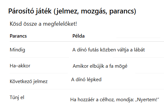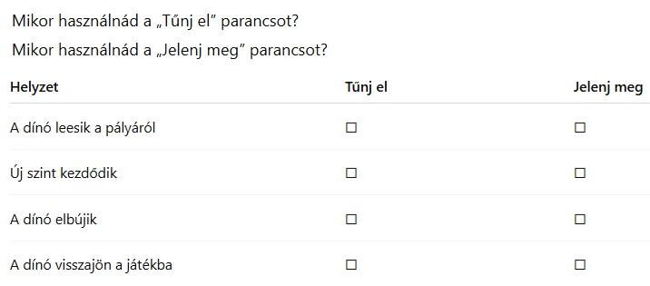 - A játék folyamán mindig, ha a dinó nekimegy a fekete keretnek, kerüljön vissza a kiindulási koordinátára.
